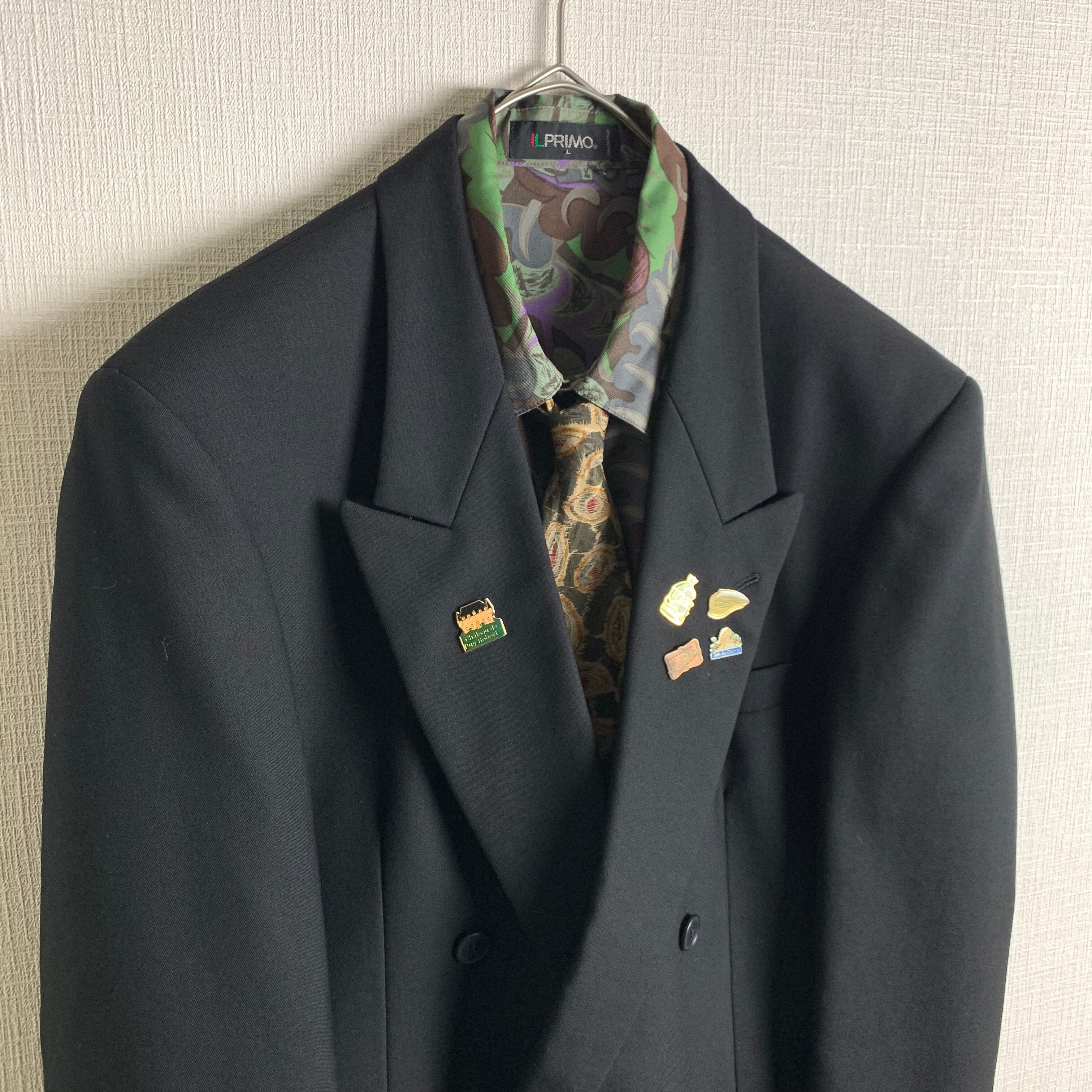セットアップ:黒のダブルセットアップにヴィンテージピンバッジを付けました。