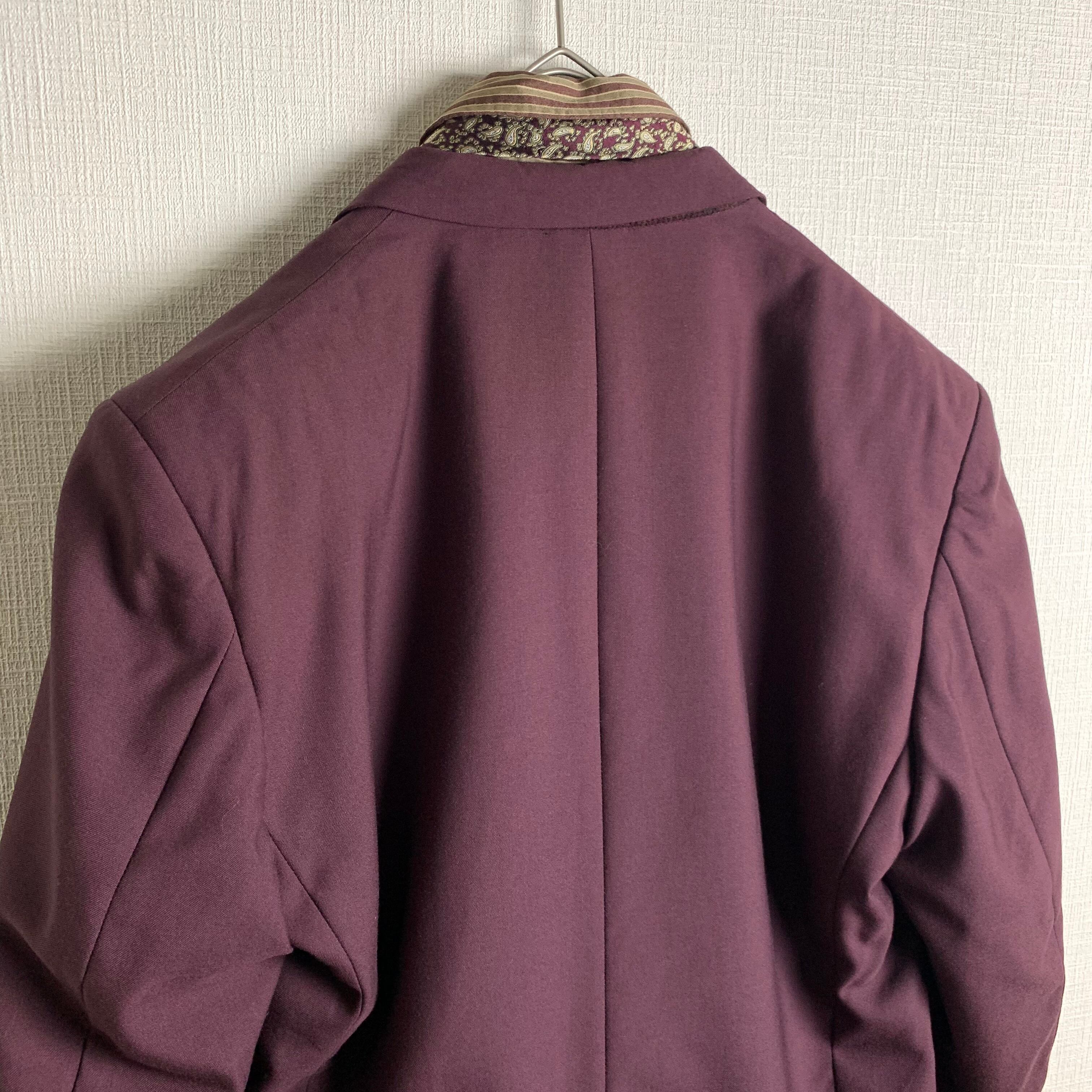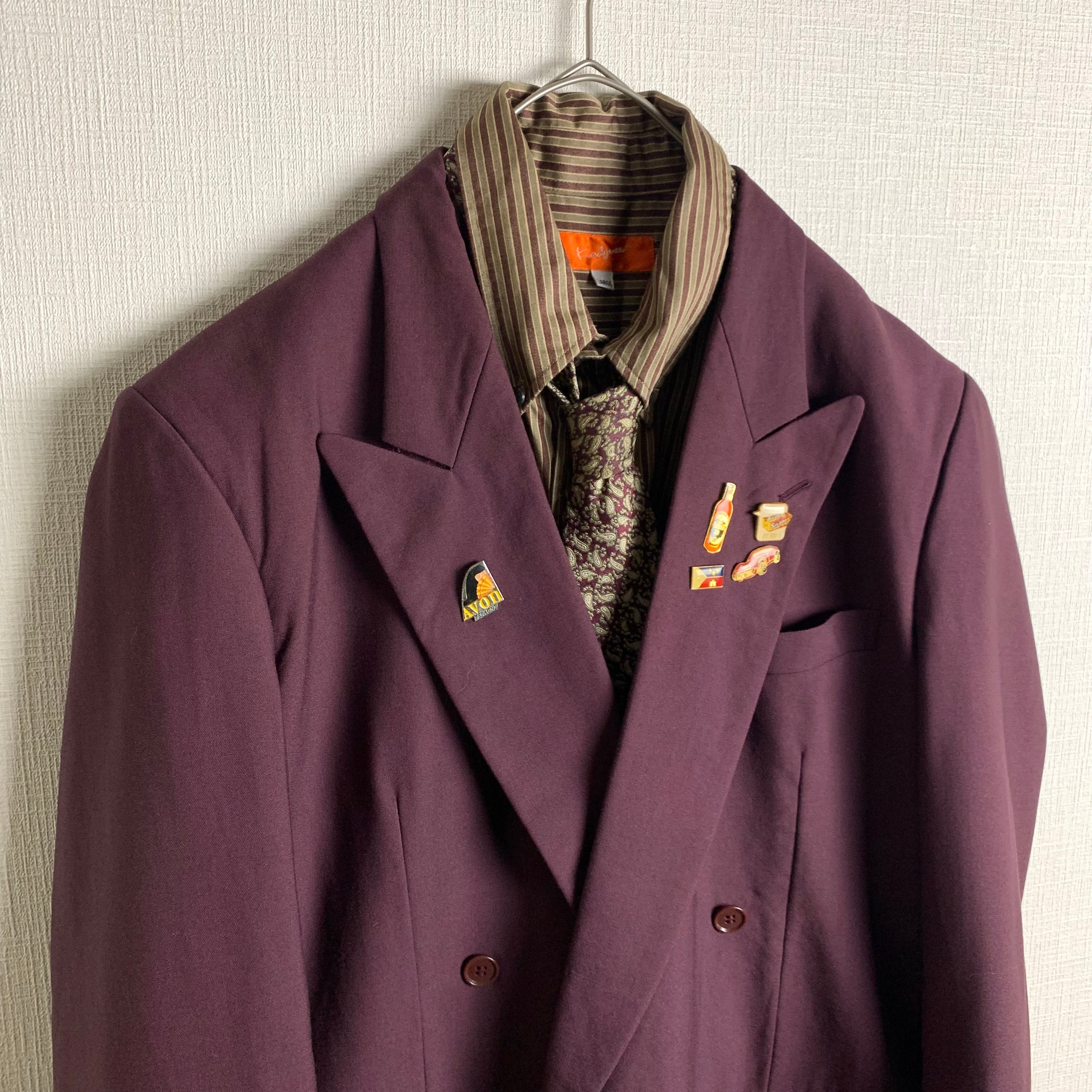 セットアップ:ワイン色のダブルセットアップにヴィンテージピンバッジを付けました。