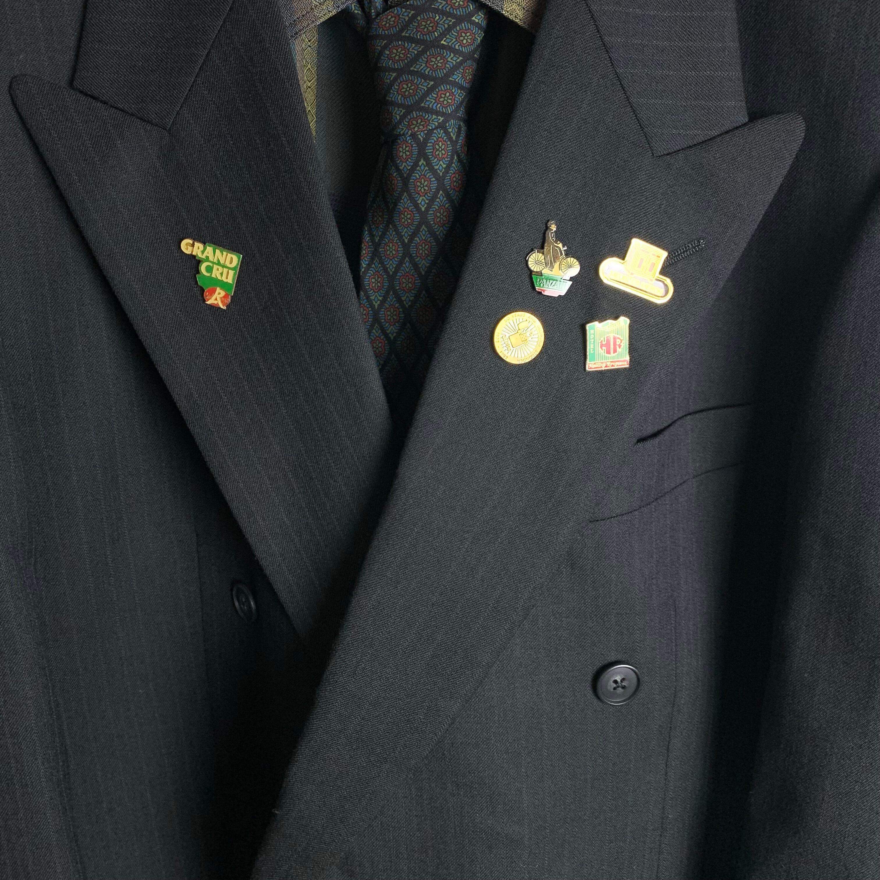 セットアップ:ピンストライプのダブルセットアップにヴィンテージピンバッジを付けました。