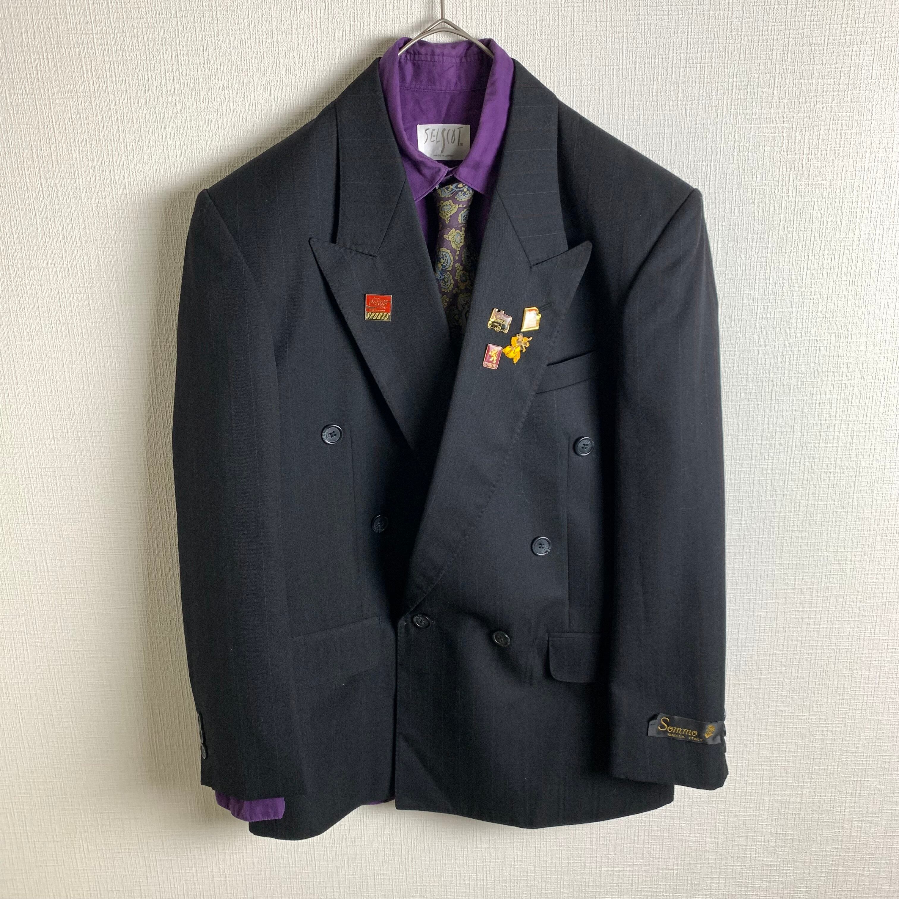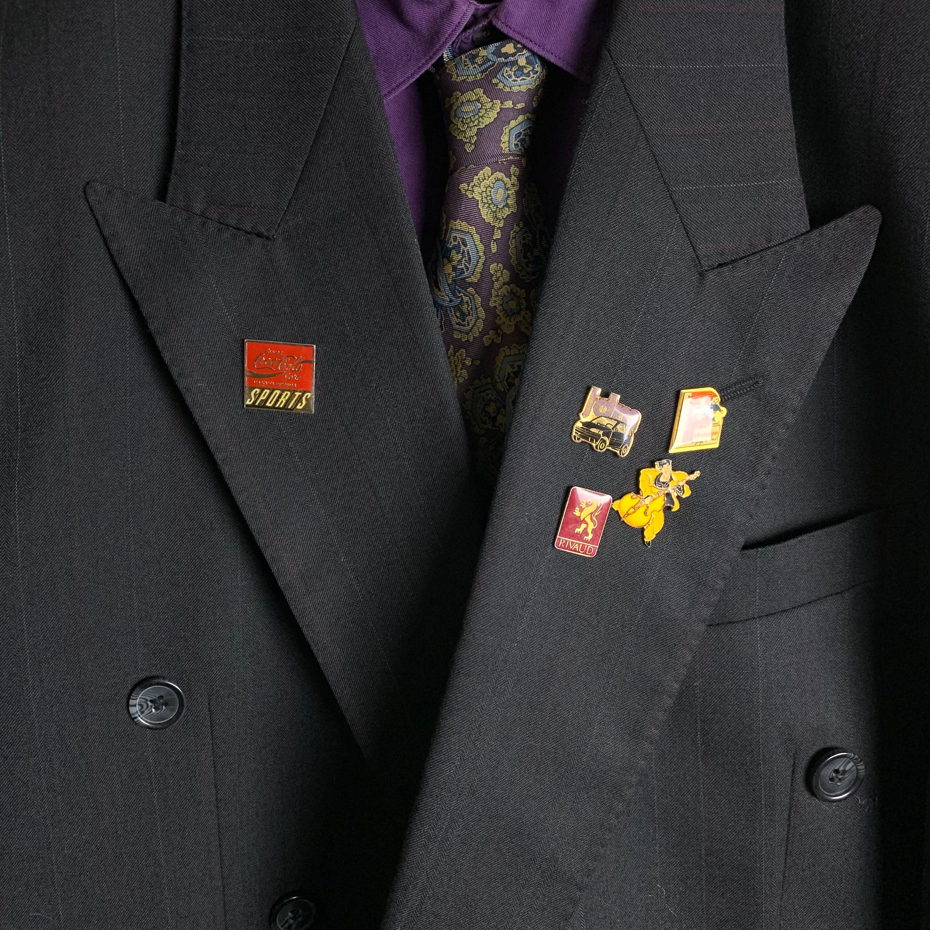 セットアップ:ストライプのダブルセットアップにヴィンテージピンバッジを付けました。