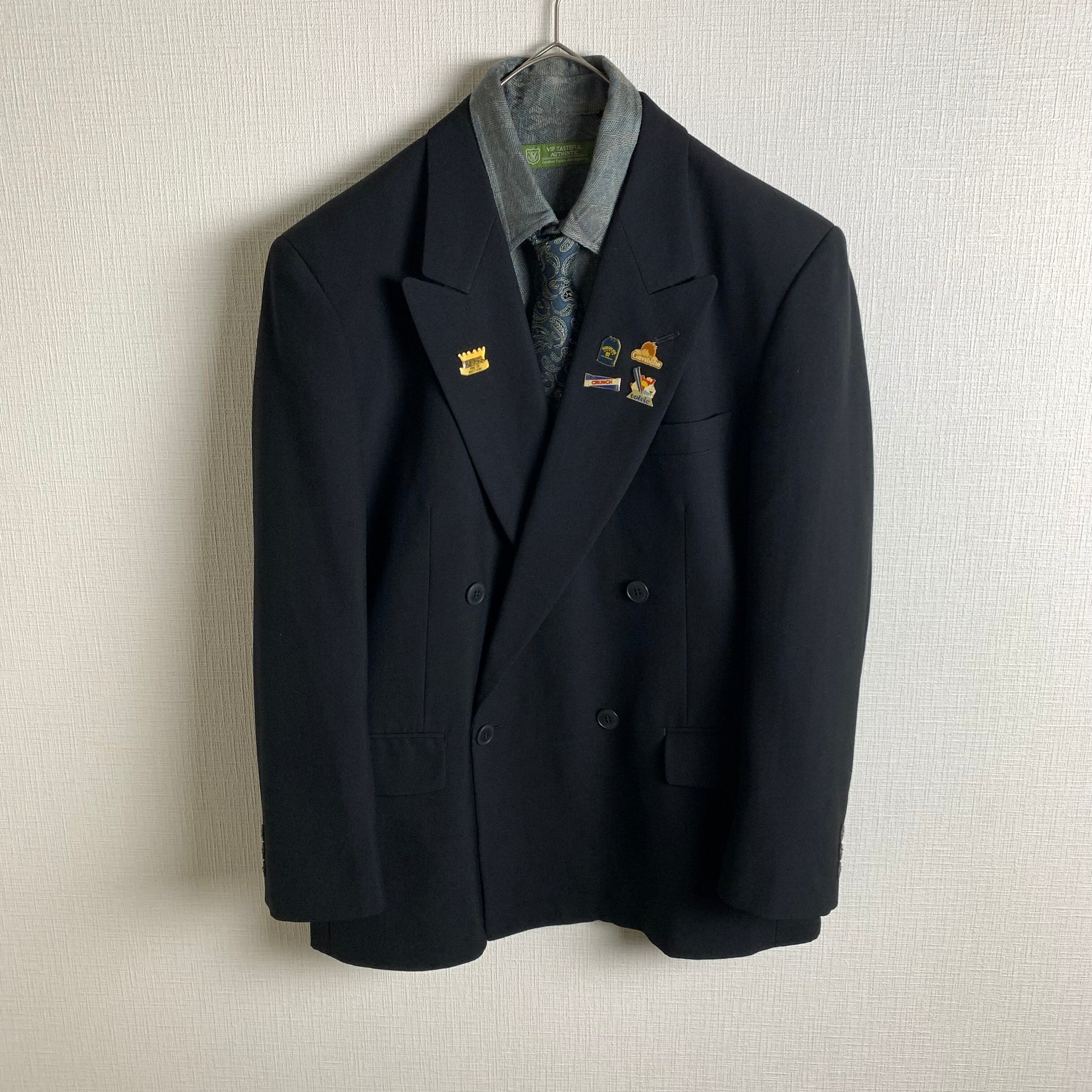 セットアップ:黒のダブルセットアップにヴィンテージピンバッジを付けました。