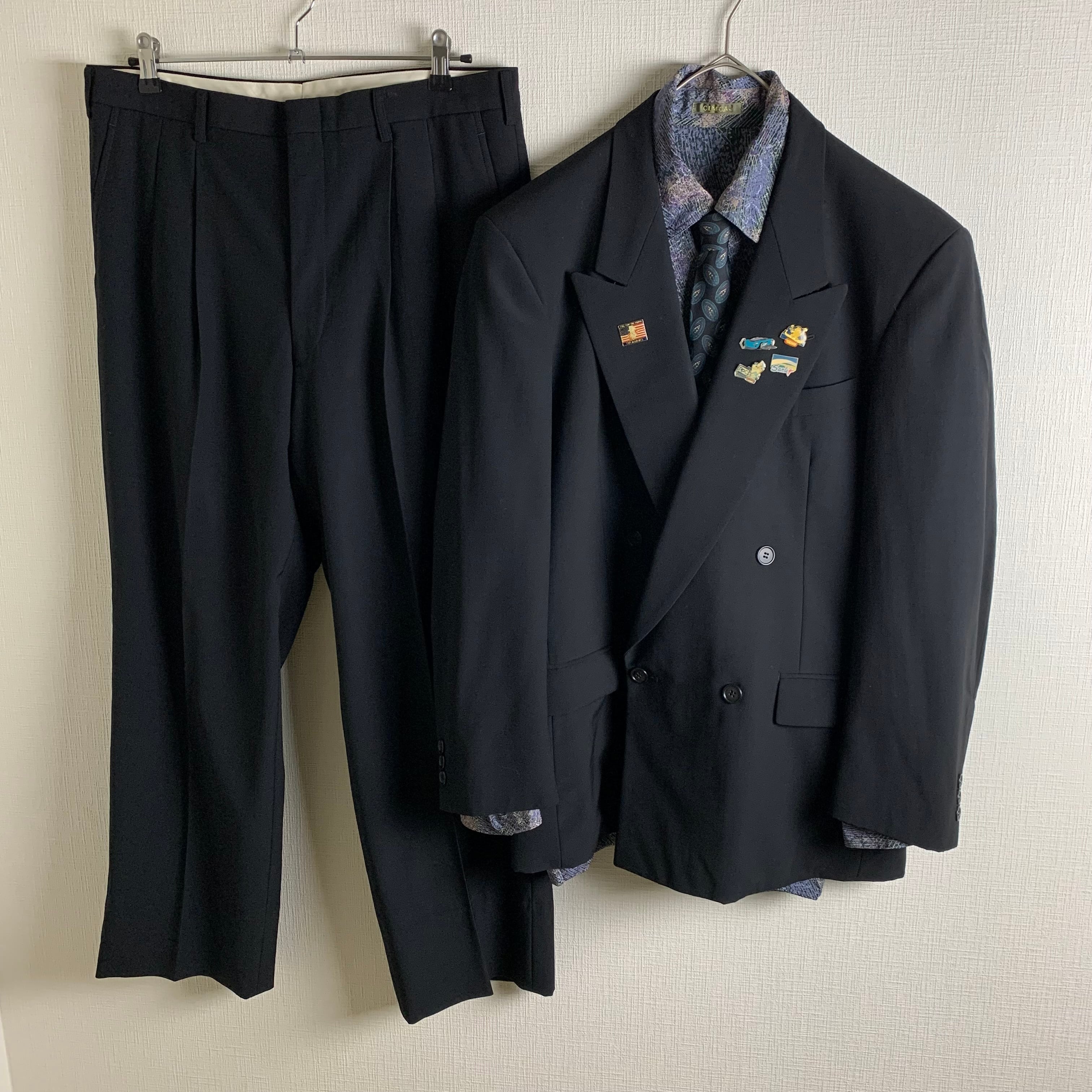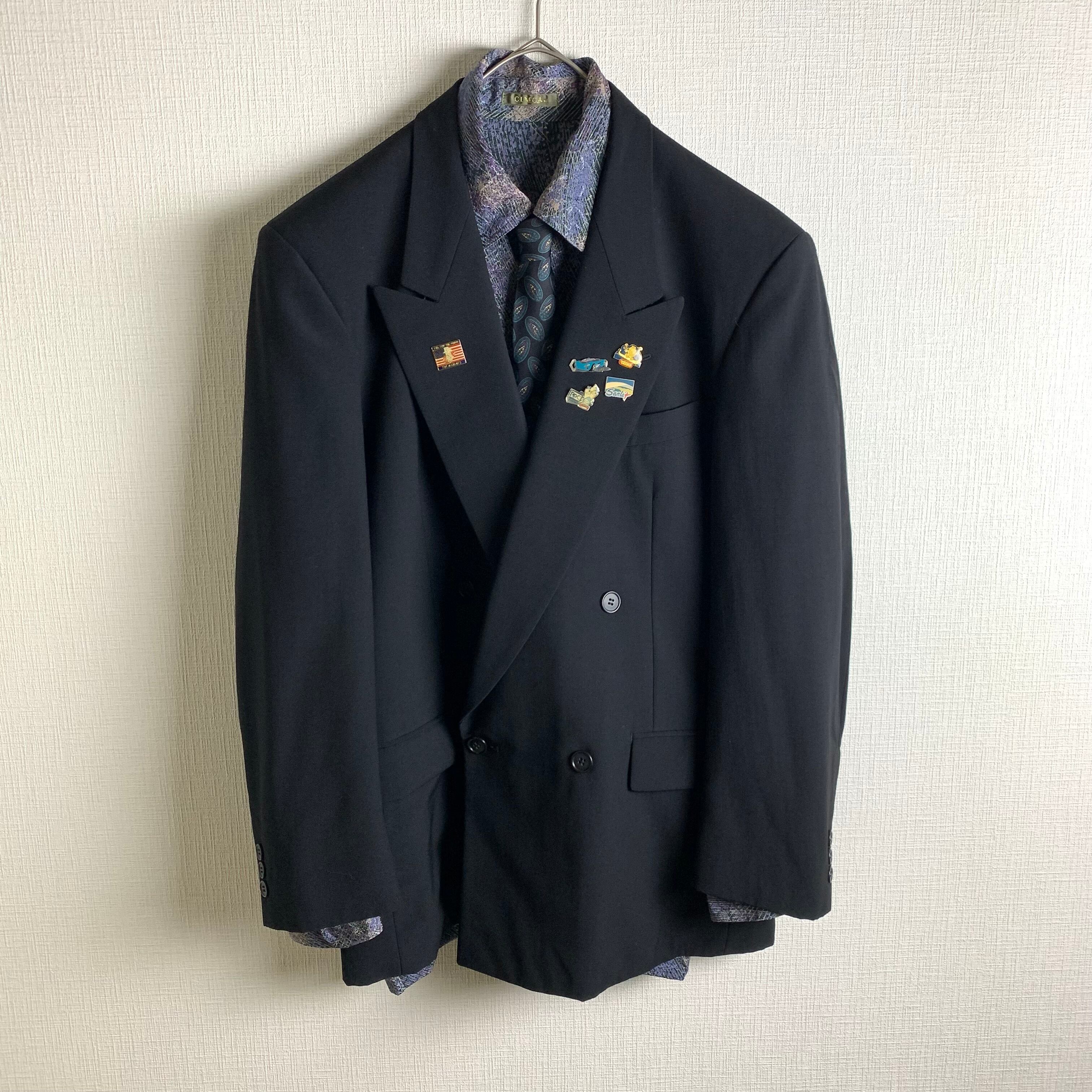 セットアップ:黒のダブルセットアップにヴィンテージピンバッジを付けました。