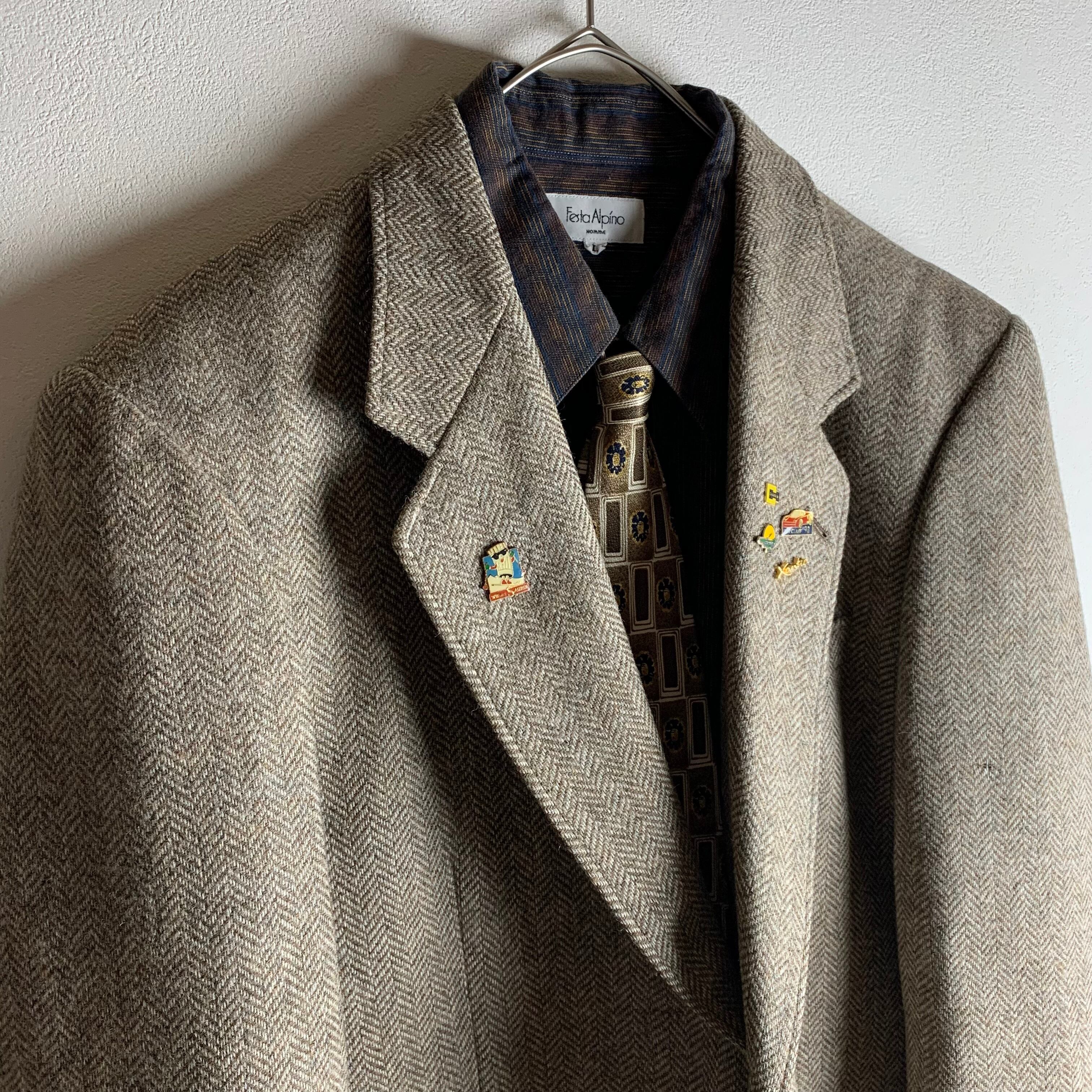 ジャケット:ツイードジャケットにヴィンテージピンバッジを付けました。