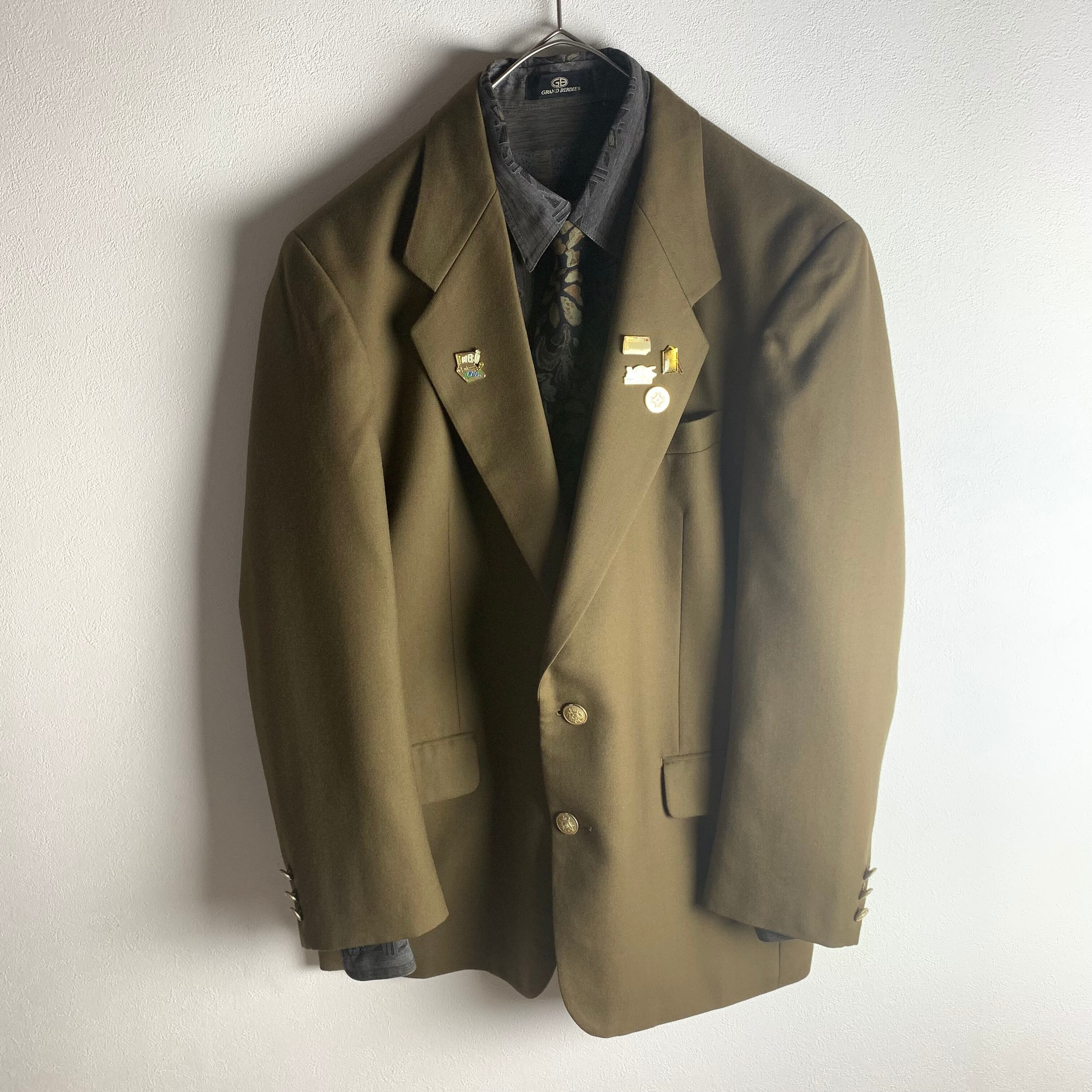 ジャケット:金ボタンのブラウンジャケットにヴィンテージピンバッジを付けました。