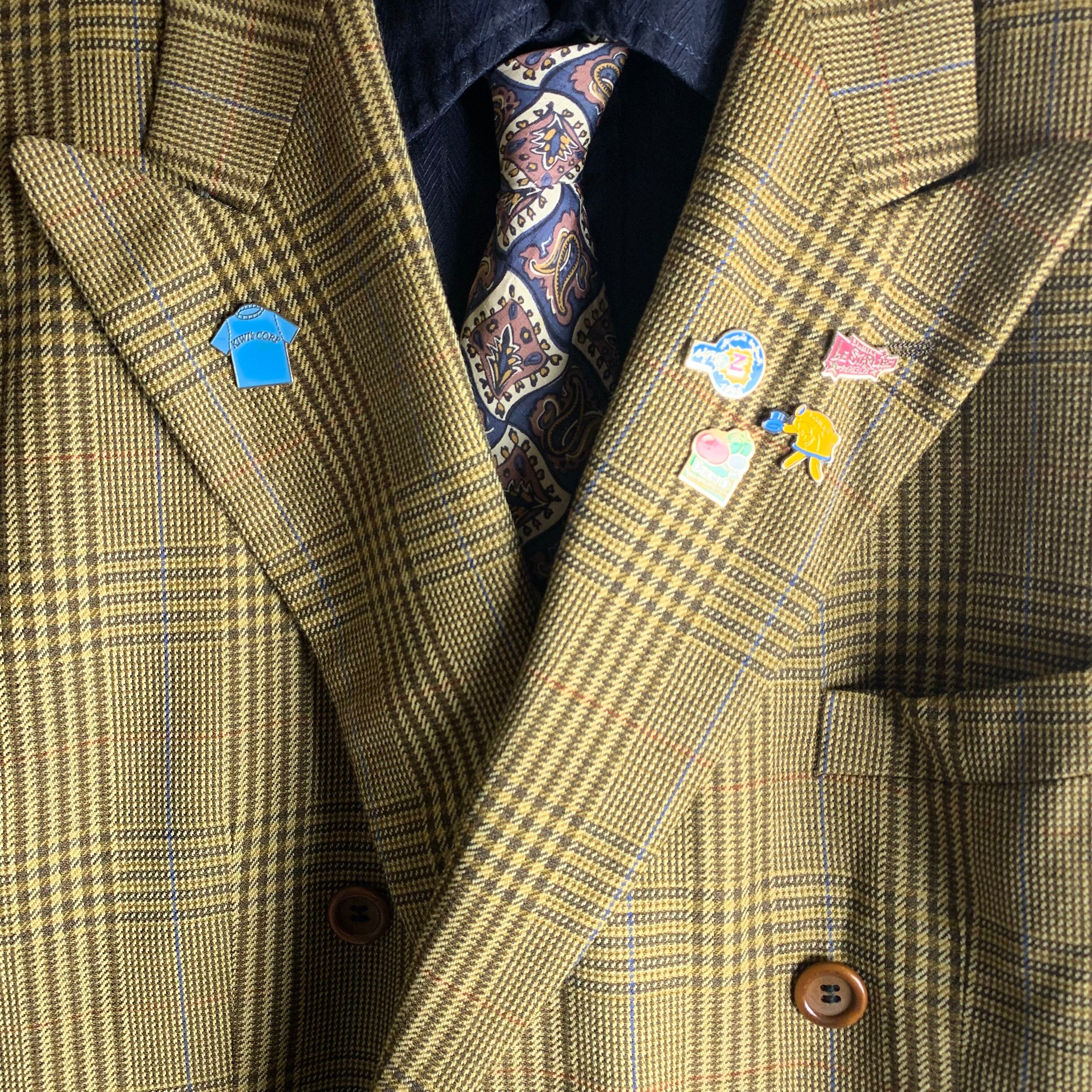 ジャケット:カシミヤ混のチェック柄くすみカラージャケットにヴィンテージピンバッジを付けました。