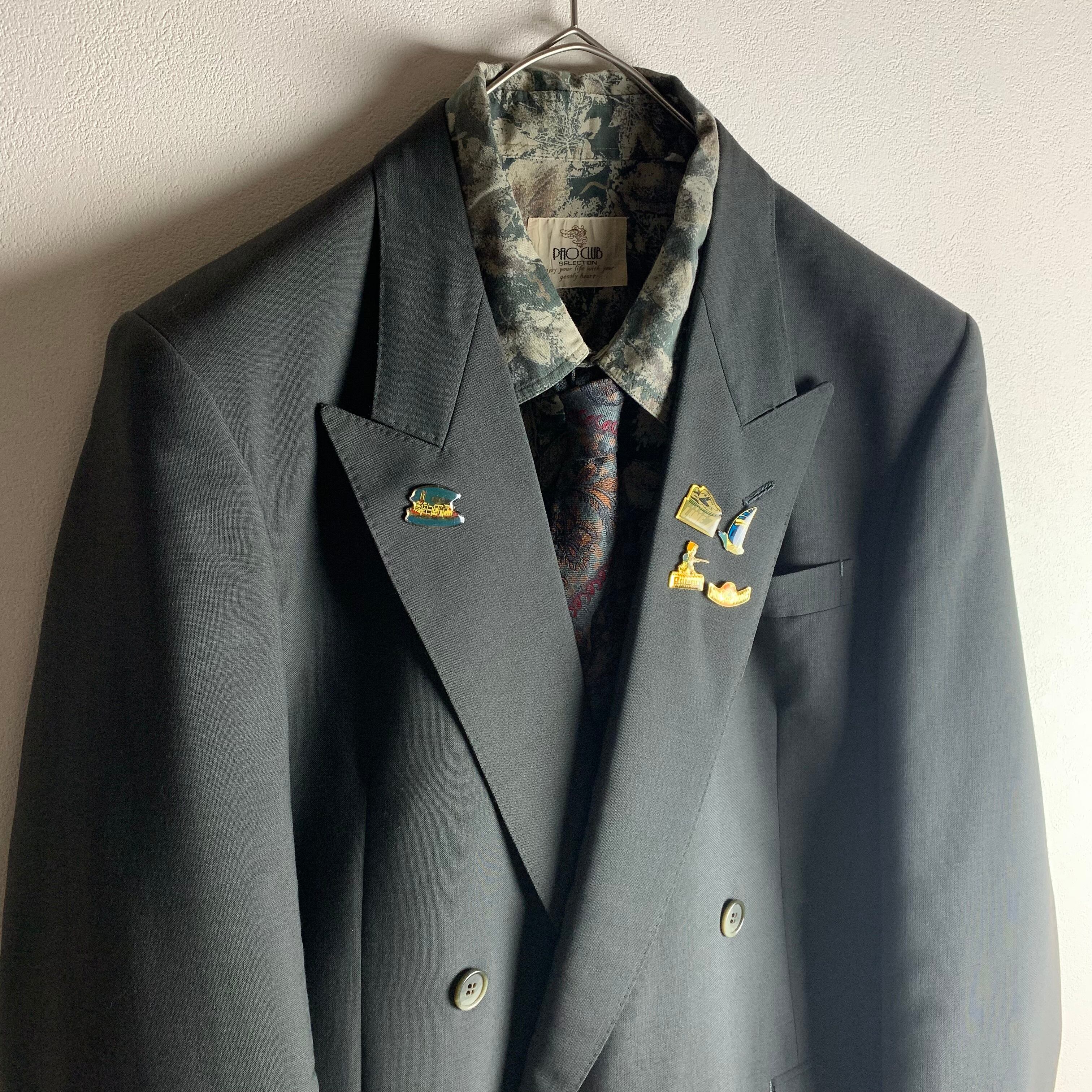 セットアップ:ダークグリーンダブルセットアップにヴィンテージピンバッジを付けました。