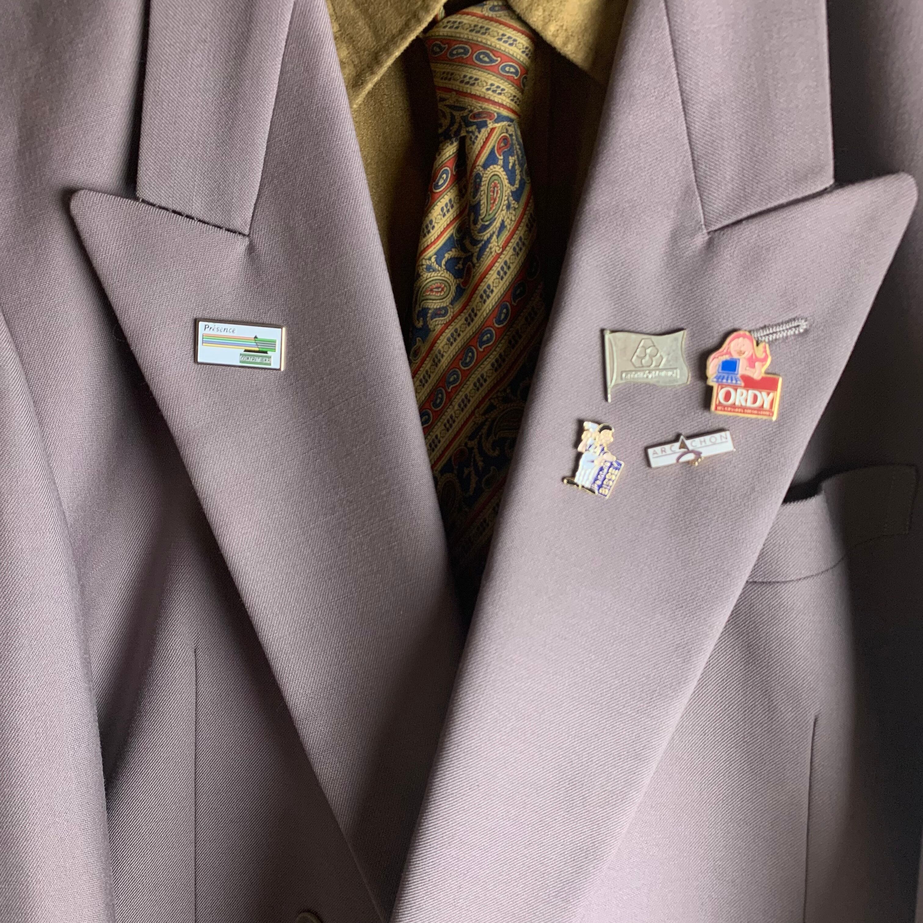 セットアップ:あずき色のダブルセットアップにヴィンテージピンバッジを付けました。