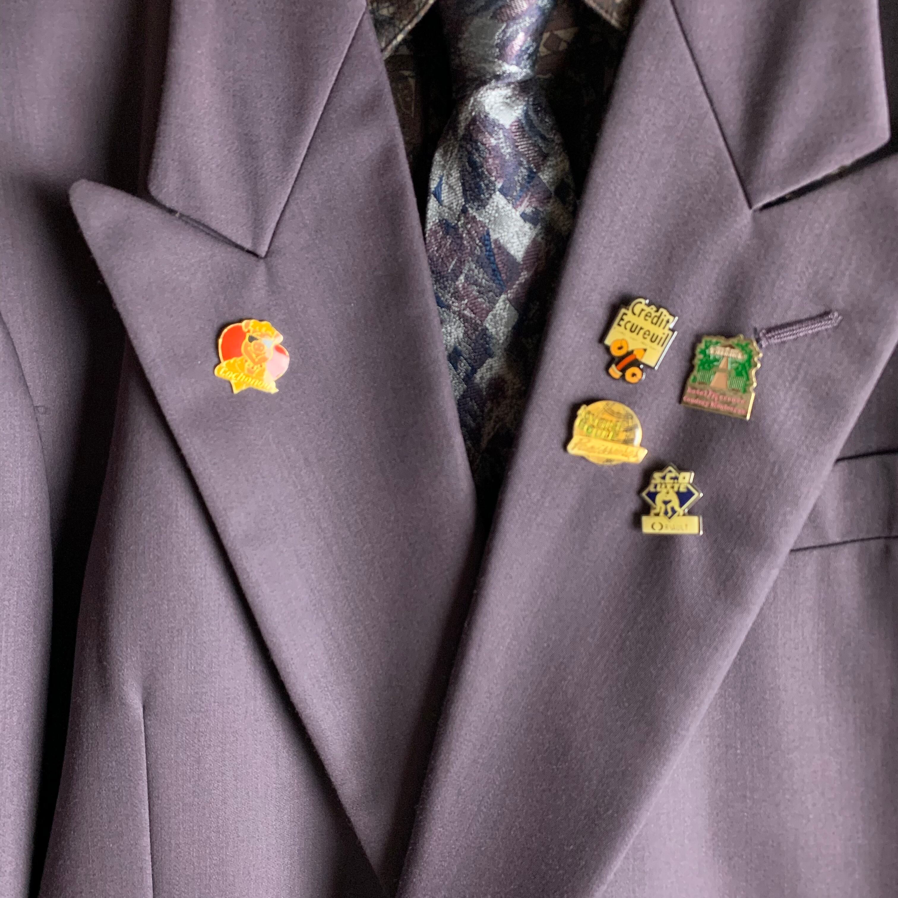 セットアップ:くすみパープルのダブルセットアップにプランヴィンテージピンバッジを付けました。