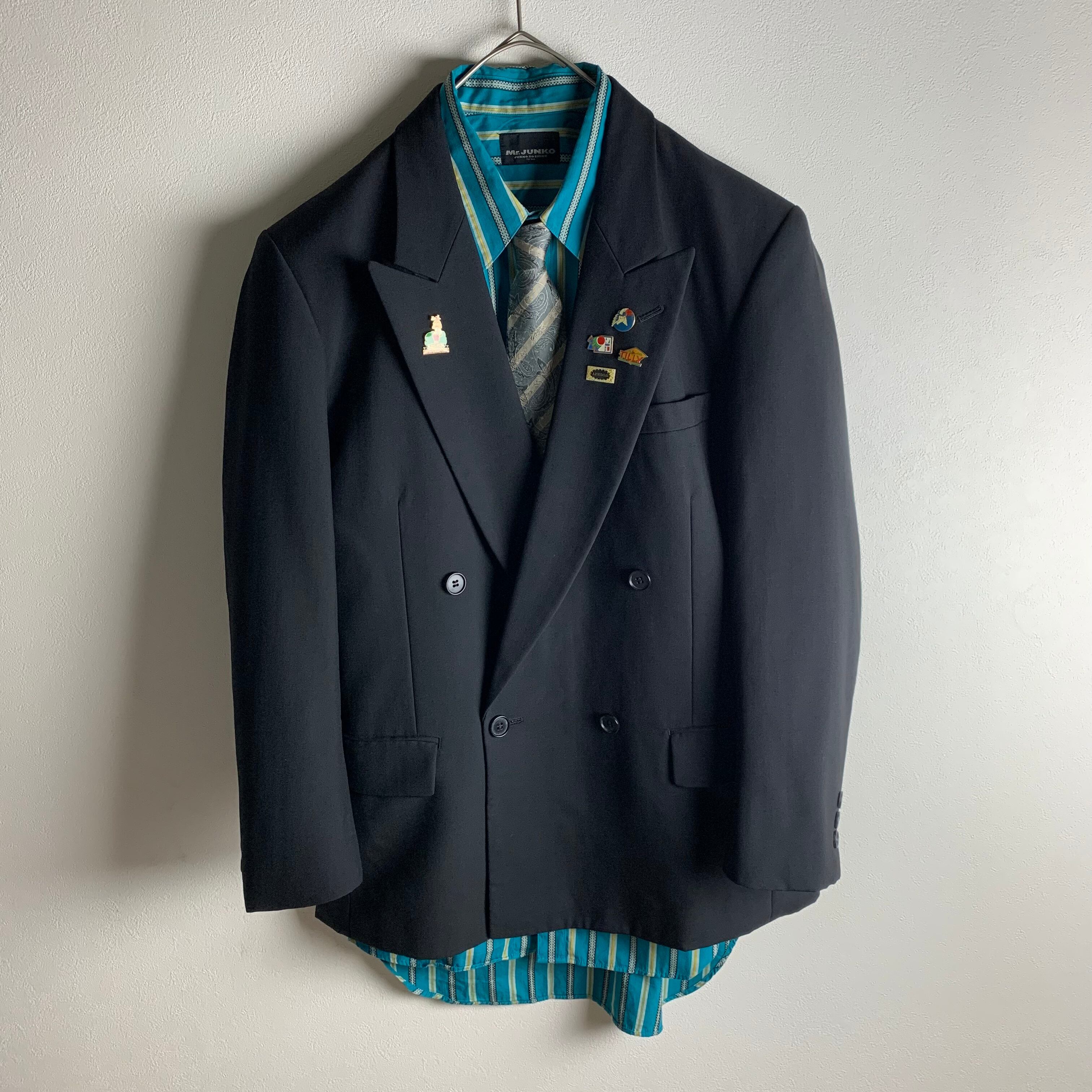 セットアップ:ブラックのダブルセットアップにフランスヴィンテージピンバッジを付けました。