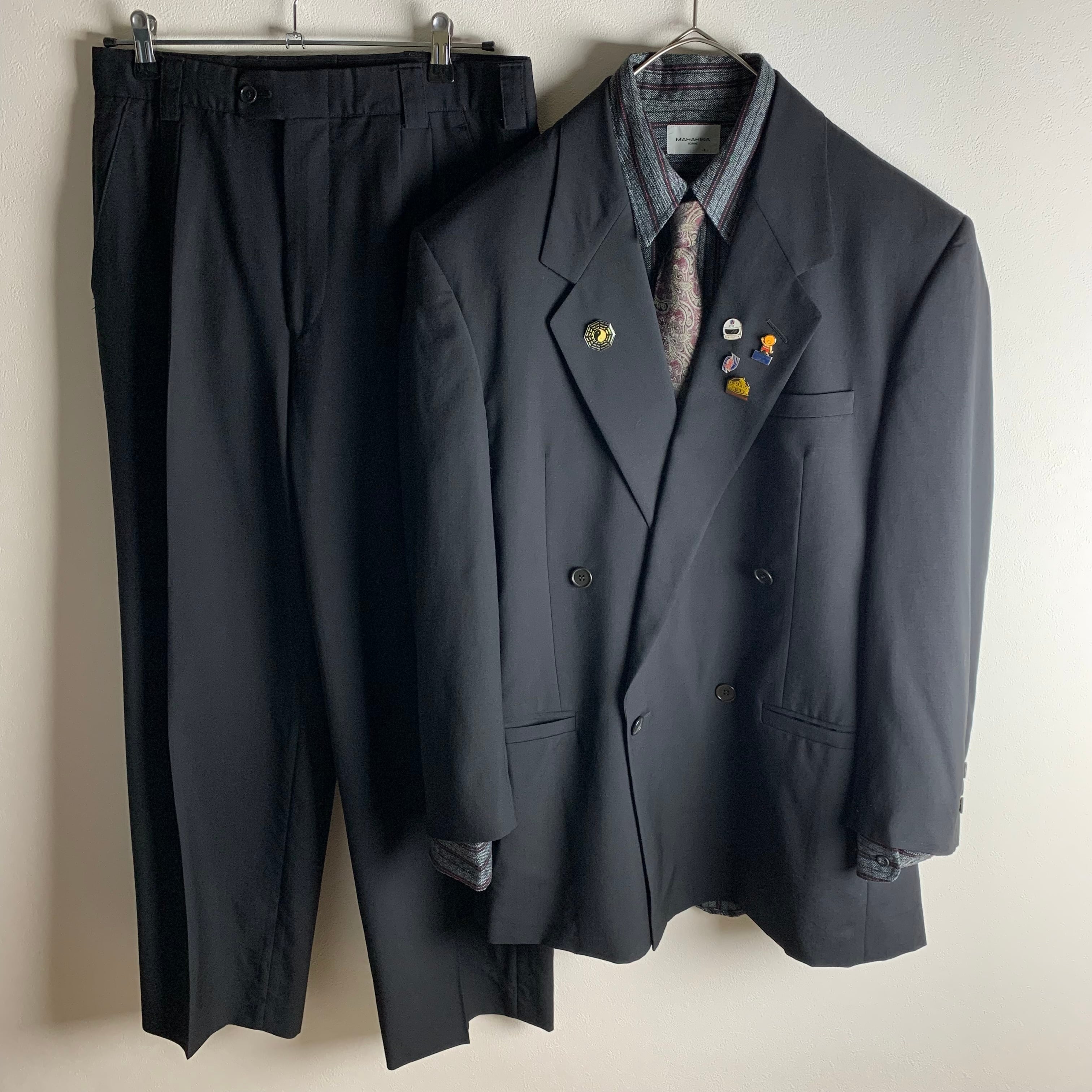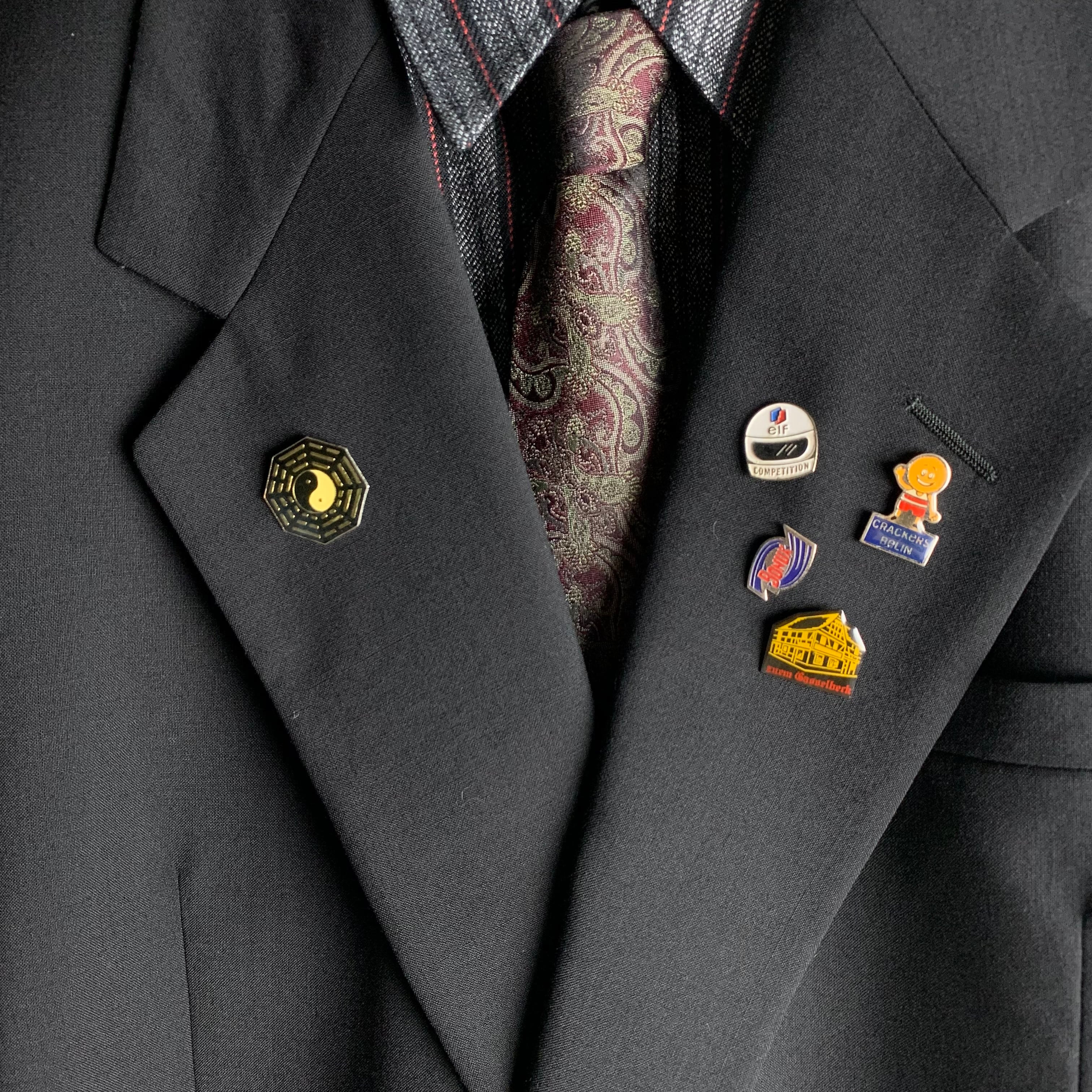 セットアップ:ヴェルサーチのスペイン製ダブルセットアップにフランスヴィンテージピンバッジを付けました。