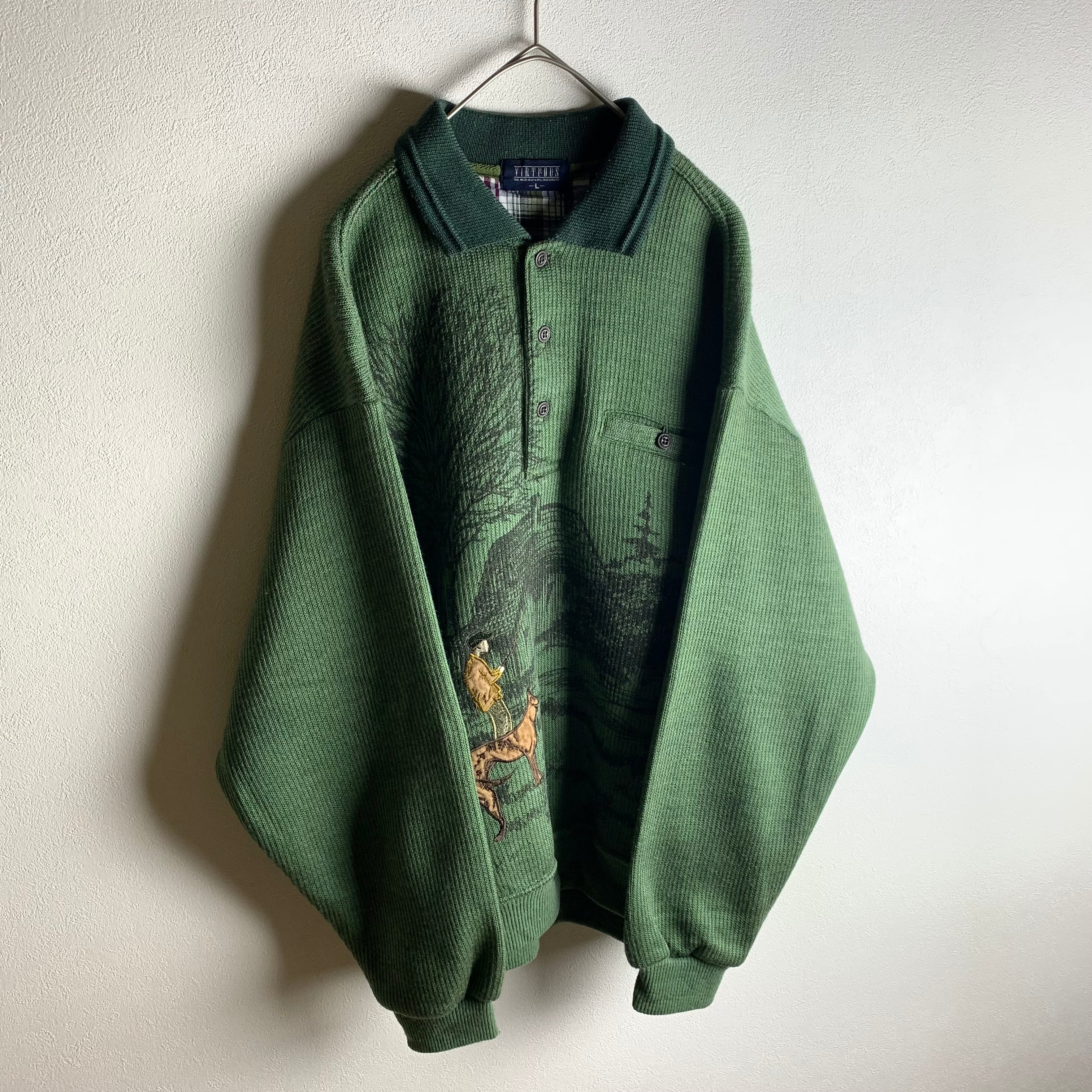 アニマル刺繍で風景画のポロニットです。