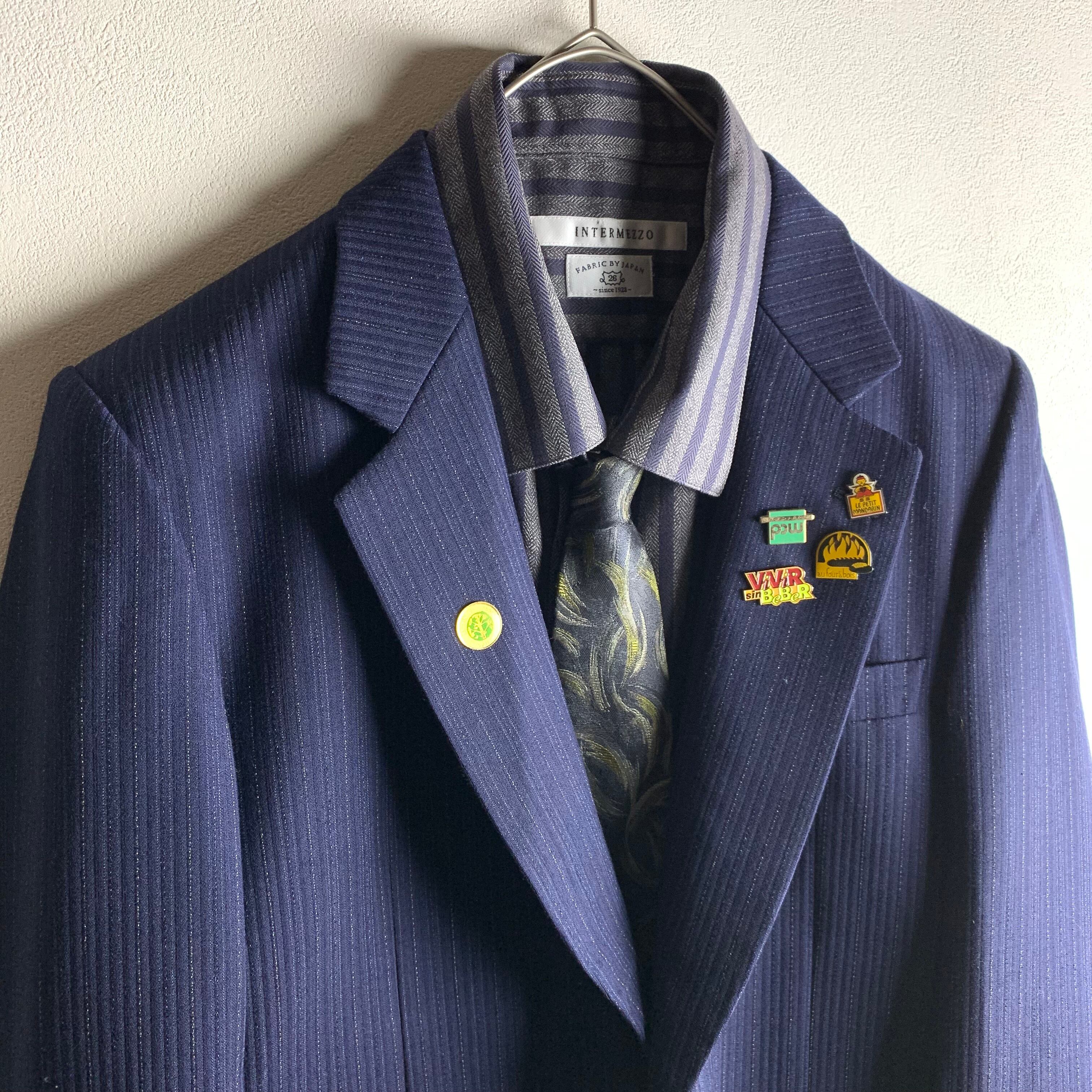 セットアップ:ステッチ風デザインのセットアップにフランスヴィンテージピンバッジを付けました。