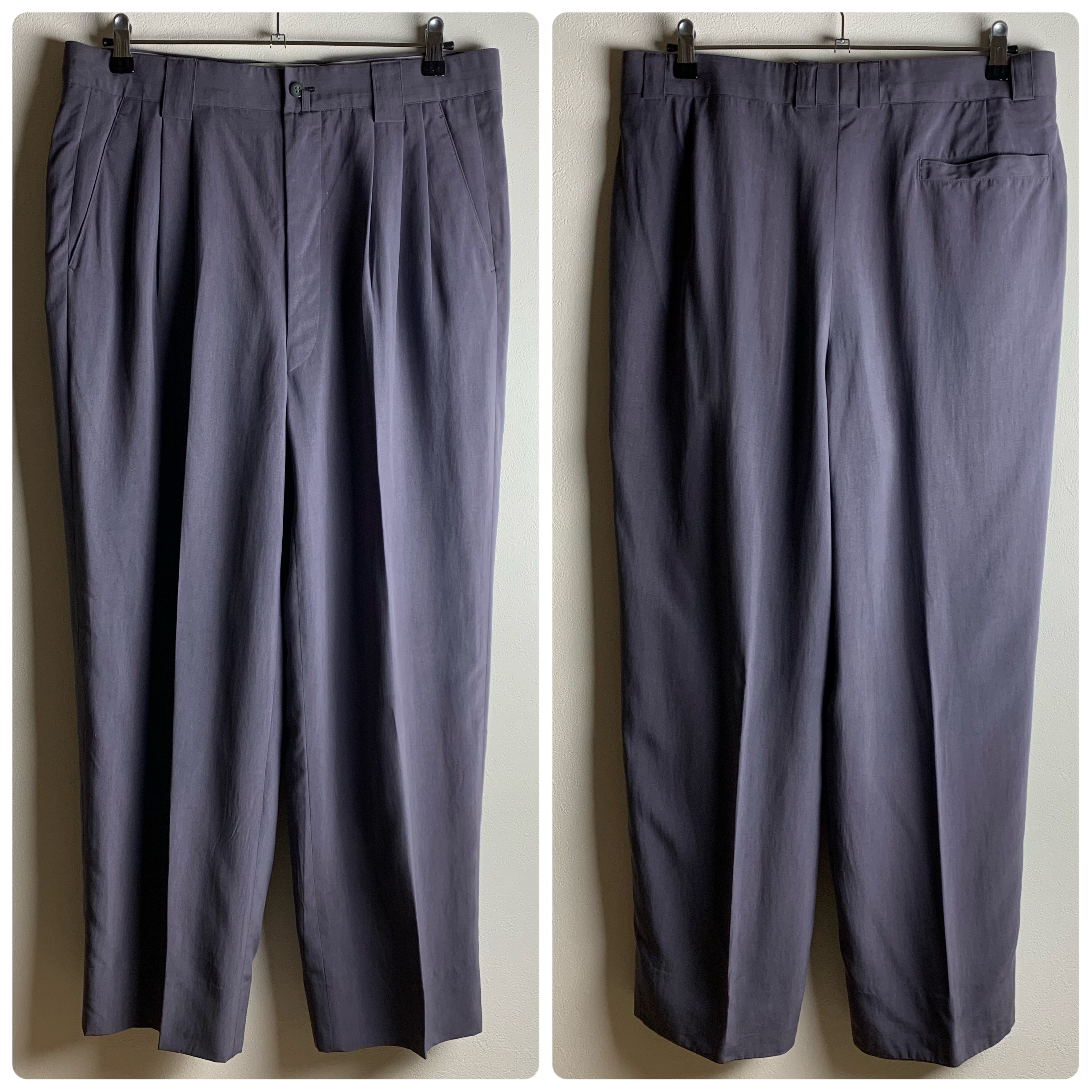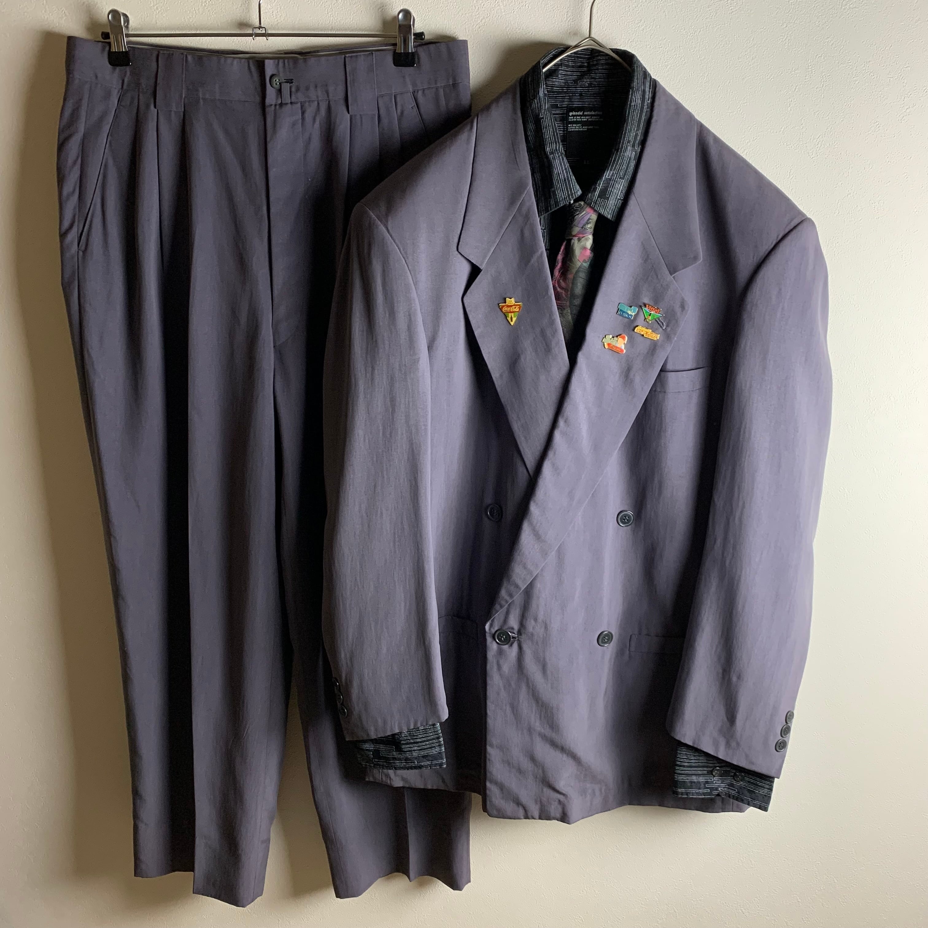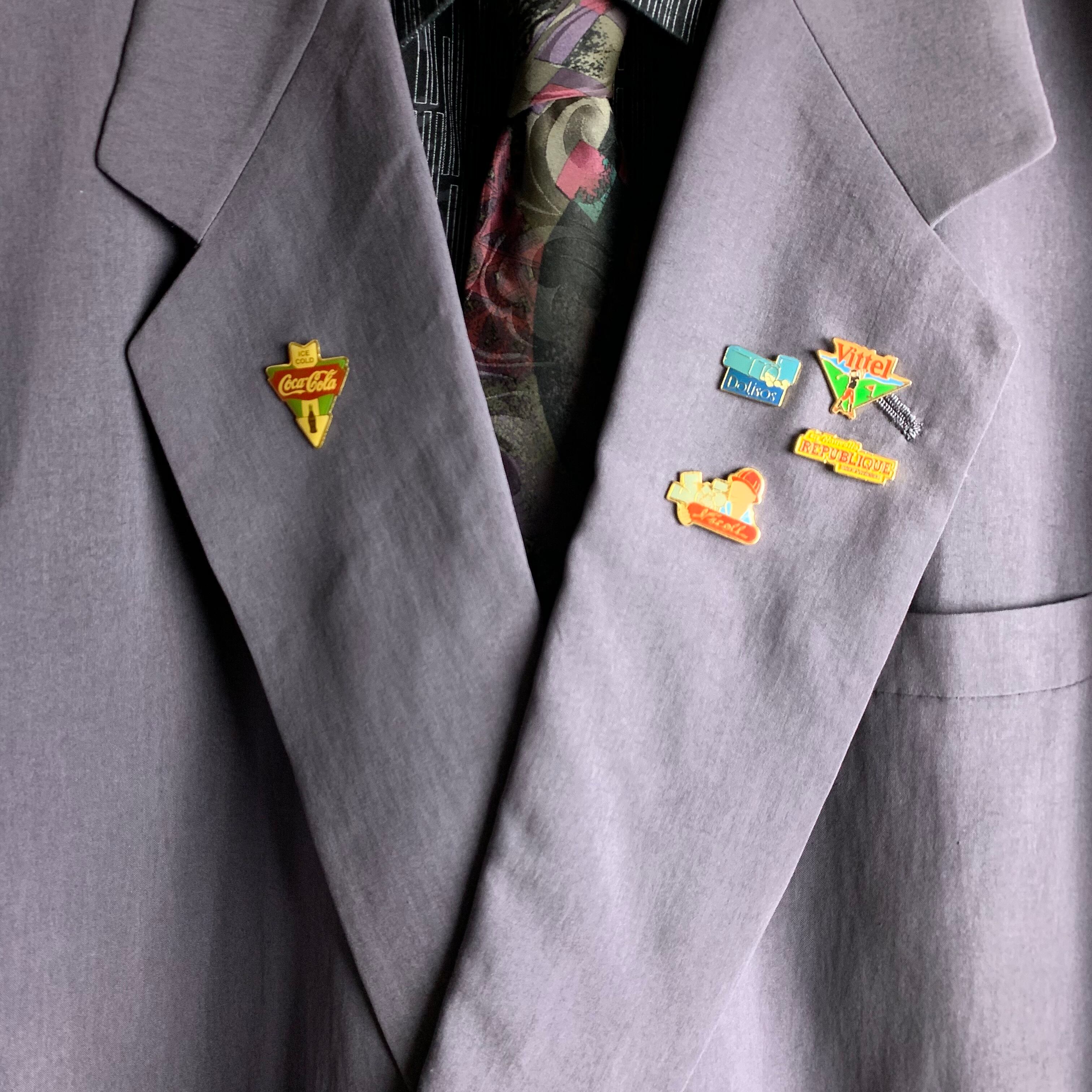 セットアップ:くすみパープルのダブルセットアップにフランスヴィンテージピンバッジを付けました。
