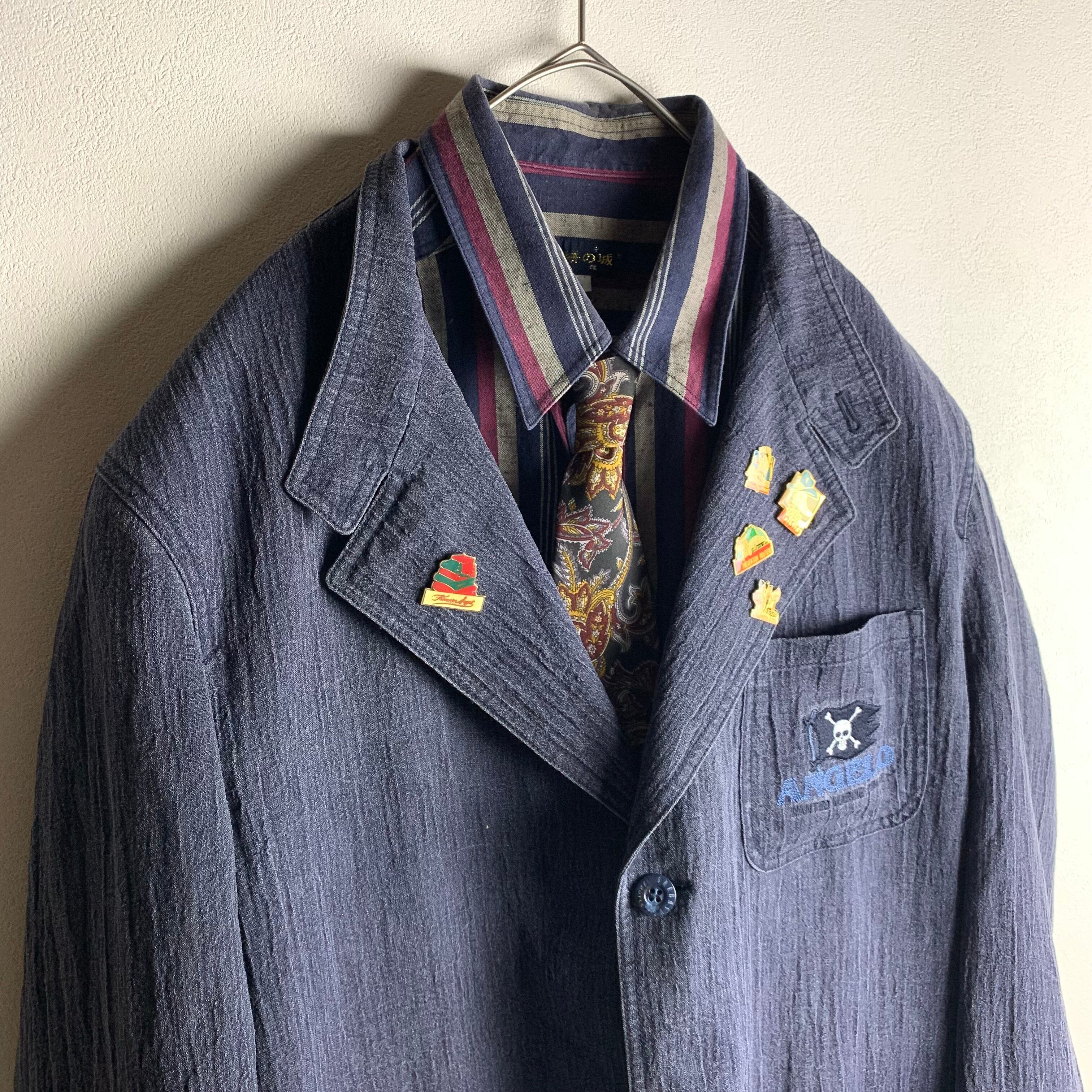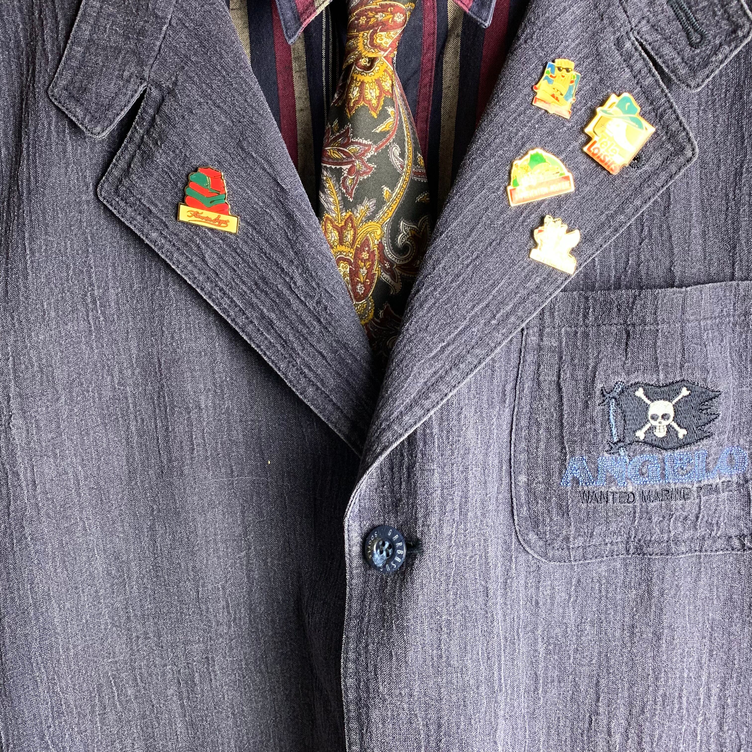 セットアップ:キャラ刺繍でシワ加工の薄生地セットアップにヴィンテージピンバッジを付けました。