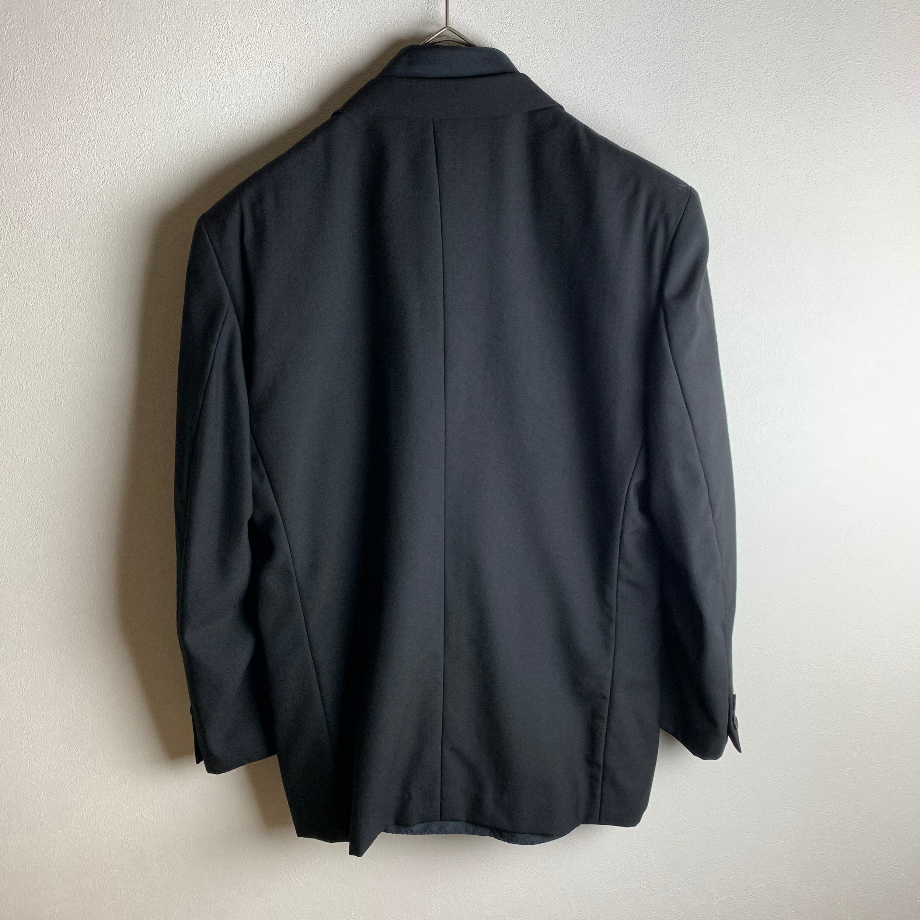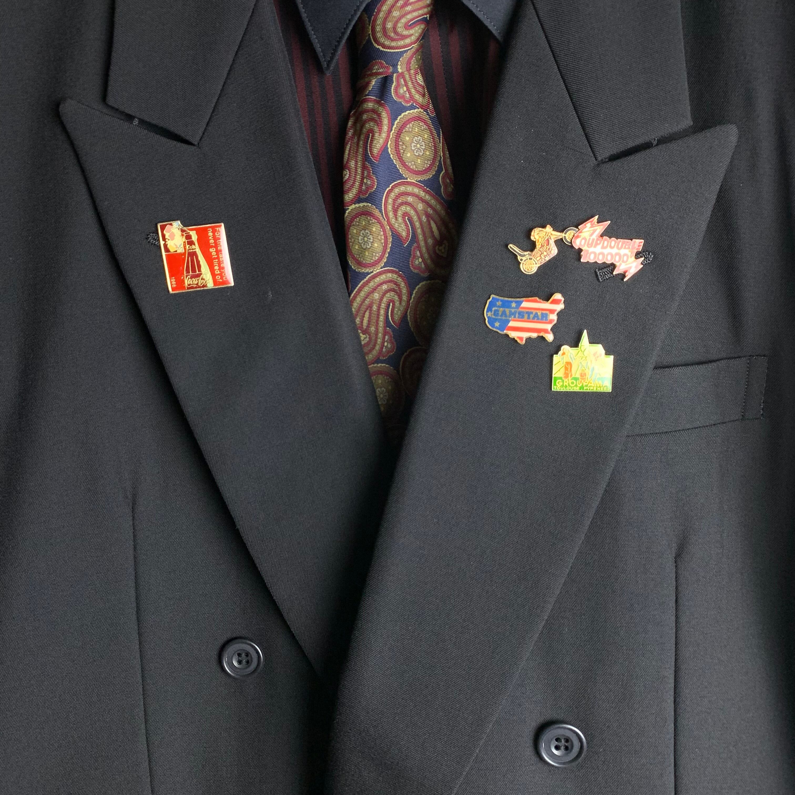 セットアップ:黒のダブルセットアップにヴィンテージピンバッジを付けました。